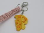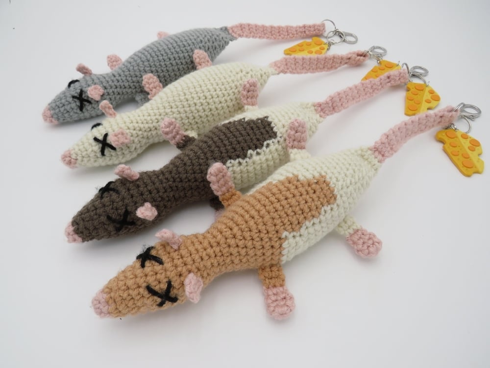 Crochet Rat Charm stuffed with silky poly-fill and a polymer clay cheese charm with a gloss glaze